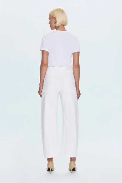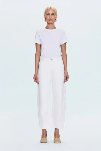 The reimagined bowed straight, Beau features sculptural seamed crescents and a cropped 27" inseam that bring a modern, architectural edge to classic denim. The raw hem keeps it easy, the wide opening adds balance. Crafted from rigid non-stretch denim in Paper White—a clean, crisp hue that feels fresh, refined, and effortlessly directional.