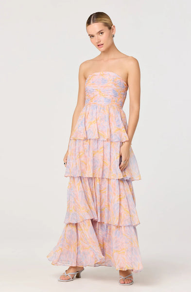 A strapless floral maxi dress finished with a tiered ruffle skirt for soft, romantic movement. Perfect for weddings, rehearsal dinners, and standout guest looks.