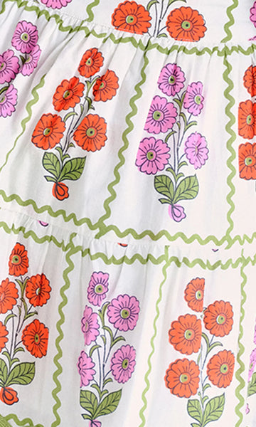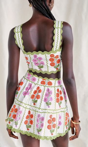 Our fan favorite Silas is back and cuter than ever! This cotton features a fitted bra top made from an adorable grid floral pattern ready for a picnic. The ricrac trim adds that perfect retro vibe. Dress it up, dress it down, or just wear it to make people smile. Pair with our 'Grid Block Silas Mini Skirt' for the perfect matching set.