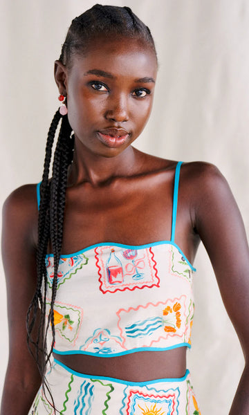 Add a stamp in your passport and stamps in your wardrobe! Our Tashi top is the perfect top for a getaway, the top is made from a stamp printed linen. The cotton/linen blend fabric, keep Tashi soft and breathable. Get ready to book your next vacay with Tashi. Pair with our 'Stamp Print Midi Skirt' for the perfect matching set!