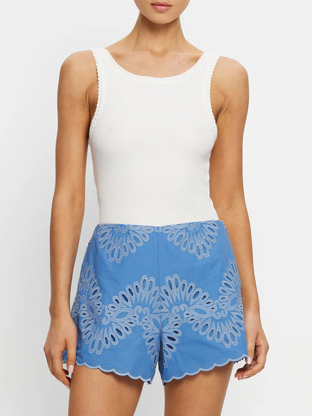 The Danielle Short is a mid-rise silhouette crafted from blue cotton broderie, featuring a fitted waistband and a scalloped hem for a refined finish. Designed for light, effortless wear through warmer days. Style with the matching 'Danielle L/S Top' or pair with a simple tank and sandals for relaxed weekend plans.