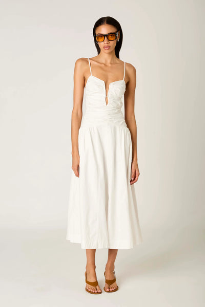 Striking from every angle, the Sawtelle Dress is crafted with a ruched, form-hugging bodice that draws the eye inward before releasing into a softly voluminous midi skirt. A deep V-neckline—accented by a refined center notch—adds a bold edge, while slender adjustable straps frame an open back for a balanced finish. Fully lined for smooth wear and fitted with a concealed back zip, this silhouette is tailored for standout moments with graceful structure and ease.