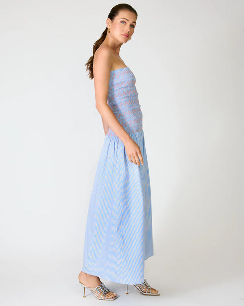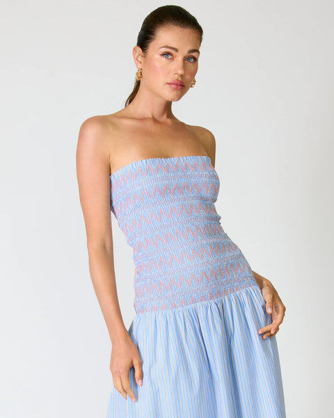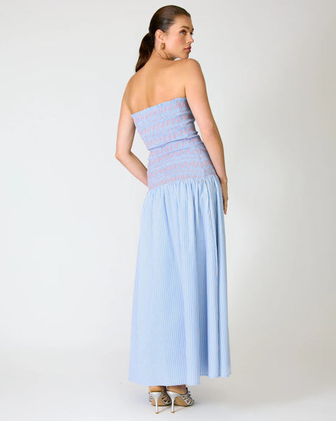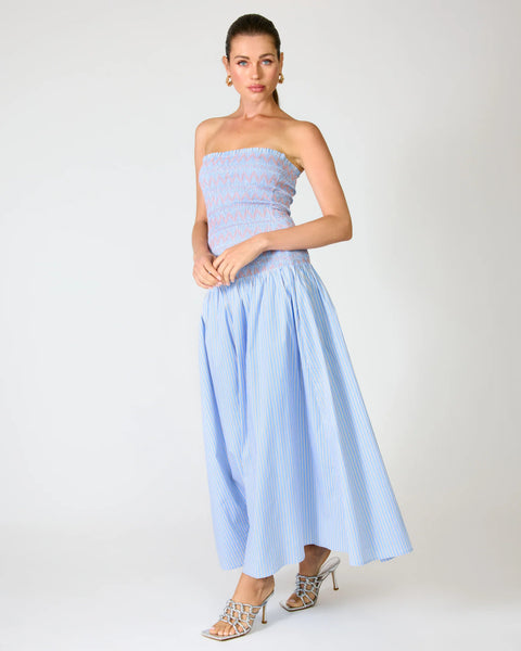 - Mid-weight non-stretch poplin fabric- Striped pattern- Strapless- Sleeveless- Smocked bodice detail- On-seam pocket- Lined